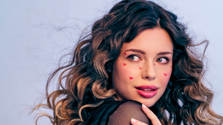 Beautiful model with drawn hearts on her cheeks posing in the studio. Fashion model is photographed in a photo studio looking away from the camera. Beautiful young woman with long hair.