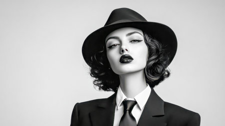 Businesswoman wearing oversized suit, tie, and hat posing in black and white