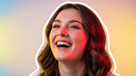 This portrait features a woman smiling. The subject's expression conveys happiness, emphasized by her eyes. The image utilizes soft lighting and a gradient background, enhancing the focus on the subject. Suitable for a range of uses, this image could be employed in various commercial and editorial contexts.