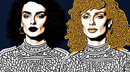 A painting of two women with curly hair. Surreal symmetrical monochromatic graphics