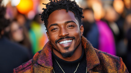 Smiling man in crowd, emanating confidence amid bustle