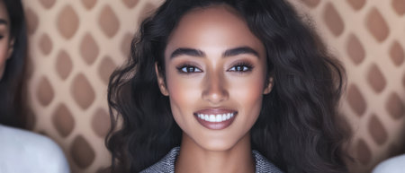 A young woman with long curly hair is smiling brightly showcasing her confidence. She is surrounded by soft warm lighting and a stylish backdrop creating an inviting atmosphere.