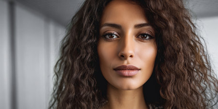 A young woman with curly hair looks directly at the camera with a confident expression. She stands in a bright room with soft lighting, showcasing her natural beauty.