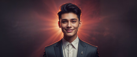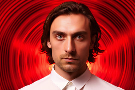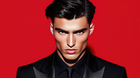 A striking portrait of a young man in formal attire, featuring dramatic lighting and a bold red background, perfect for fashion and lifestyle themes.