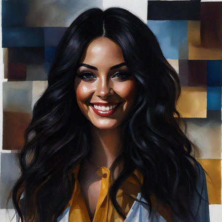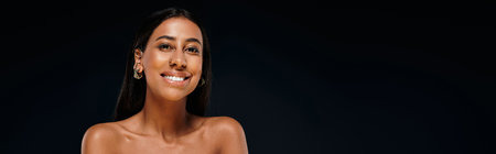 Radiant portrait of a beautiful woman with a dark blue background and a warm smile that lights up the image with joy and happiness