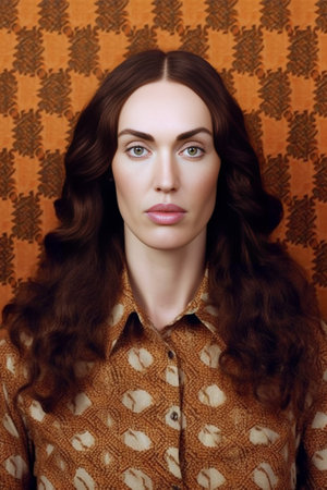 Portrait of brown eyed curly woman bites pencil Lady with wavy hair dressed in checkered jacket looks into camera on orange background : Generative AI