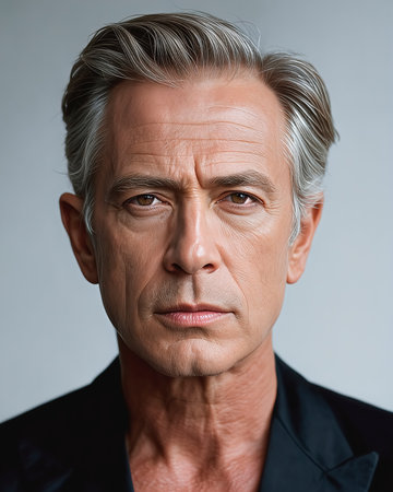 A studio striking beauty portrait in the style of Vogue magazine captures a distinguished 70-year-old European male model with deeply expressive, warm brown eyes and a subtle, natural smile gracing his lips. His silver hair is neatly styled, showcasing the elegant lines of his face and the authentic character etched by time, while he gazes directly into the camera with quiet confidence. The clean white backdrop is softly illuminated with diffused studio lighting, accentuating the textures of his skin and the refined details of his tailored charcoal gray suit. Subtle professional retouching enhances his natural features, emphasizing the beauty of mature skin and preserving the integrity of his age.