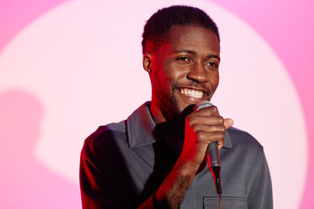 Medium shot of cheerful African American young man at light pink background speaking into microphone at party while looking away
