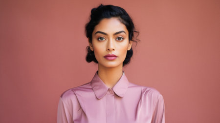 Portrait of a beautiful young woman in a pink shirt on a pink background.