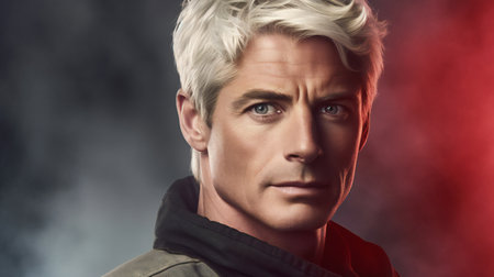 Cheerful Caucasian man smiling widely, revealing straight white teeth, against a deep ruby red background, accentuated by dramatic golden rim lighting on his wavy blonde hair and bare shoulders.