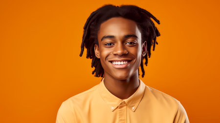 Portrait of a cheerful smiling African American teenager guy with long hair and perfect skin, orange background, banner. Advertising of teenage cosmetics, hair care products, medicines, perfumes, cosmetology, courses, college schools and trainings