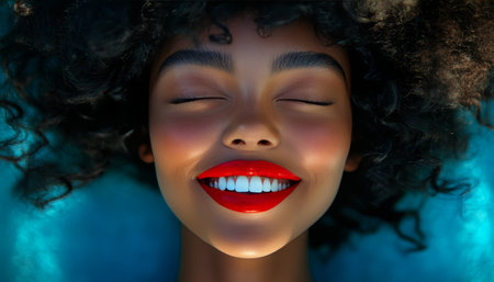 Portrait of a Beautiful Woman with Red Lipstick, Teal Background, Celebrating Diversity in Beauty