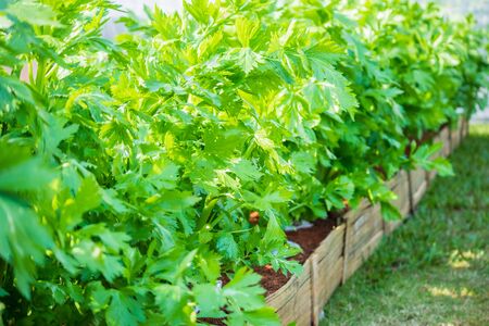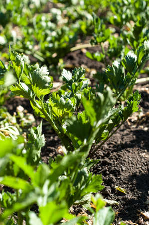 close-up of growing celery plantation (leaf vegetables) in the vegetable garden at sunny day