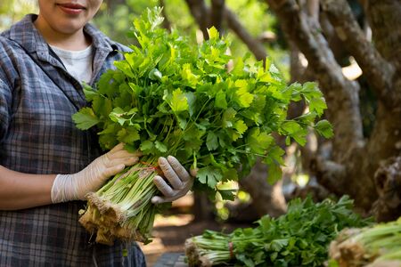 Woman agriculture holding fresh organic parsley vegetables from garden farm