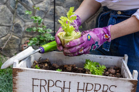 Garden seedlings in spring season, young sprouts of selery aromatic herb, garden works.