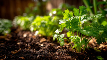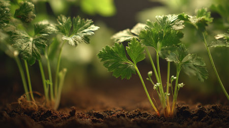 Coriander with small fresh leaves, growing upright in fertile soil, sunlight filtering gently, realistic textures, vibrant green tones, natural photography style, wide balanced composition