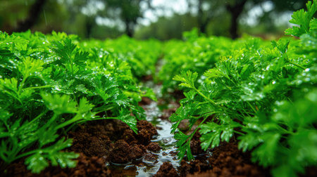 Closeup of rows of organic healthy green parsley plants