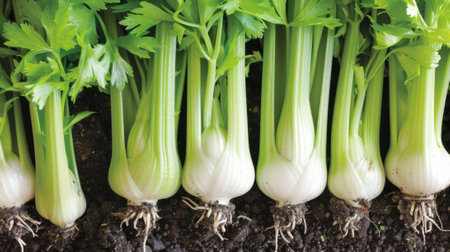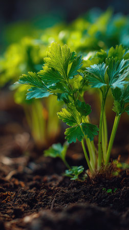 Fresh green celery leaves growing in soil in a garden.