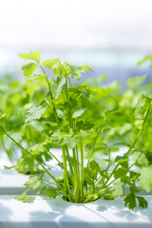 Young Chinese celery plant with Hydroponic system, organic farming, agriculture industry