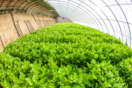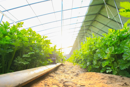 Celery vegetable are growing in greenhouse with background.