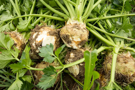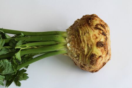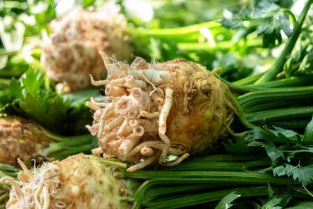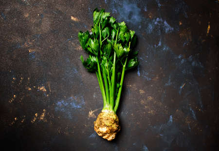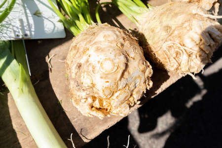 Root of celery with leaves, overhead, vegetables from local market, farm fresh produce, organic food of vegetarian diet