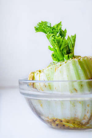 Sprouting celery root in the cup of water later to be planted in the soil. Close up.