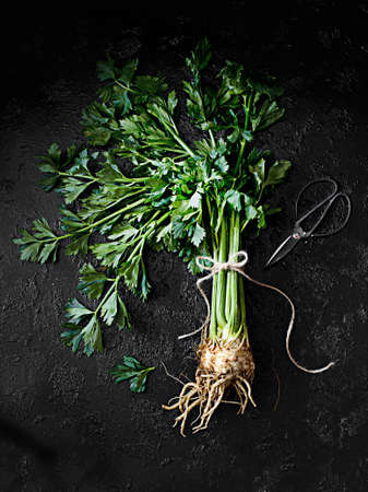 Parsley with leaves and roots, celery tuber with leaves in wicker basket. Flat lay. Copy space. Black background