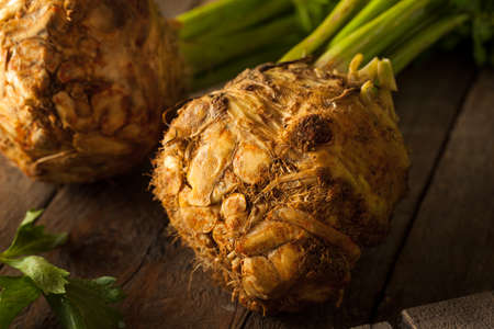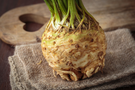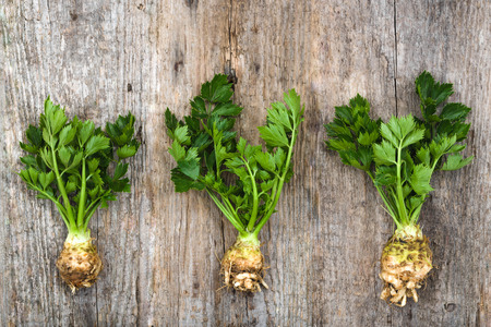 Root vegetable celera with green leaves on a wooden background, farm vegetables