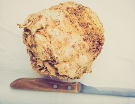 Organic celery (root celery and leaves of celery) with soil on paper background. Fresh turn off celery. Healthy food concept