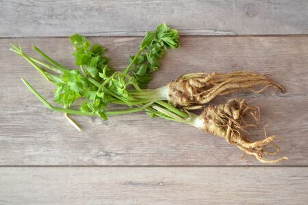 Root of celery with leaves on wooden background, vegetables from local market, farm produce, top view