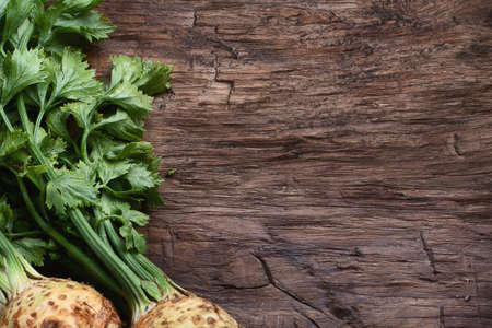 Root celery with green stems, rustic wooden kitchen table background, top view