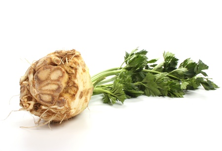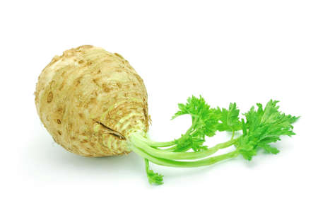 A close-up of a single fresh celery root with vibrant green stems against a white background, highlighting organic textures.