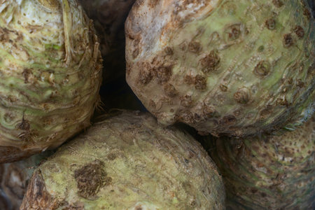 A collection of freshly organic harvested celery roots rests on a table at a farmers market during the fall season.