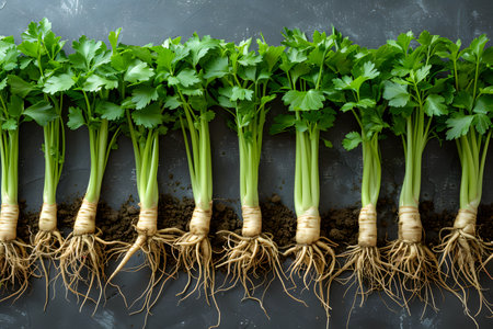 Freshly harvested celery roots with lush green leaves, laid out in a row on a dark background. the roots display intricate details of the soil clinging to them. perfect for farm, organic produce, or healthy eating-themed designs. Generative AI