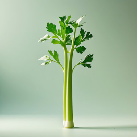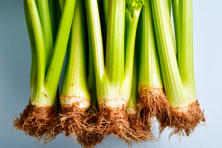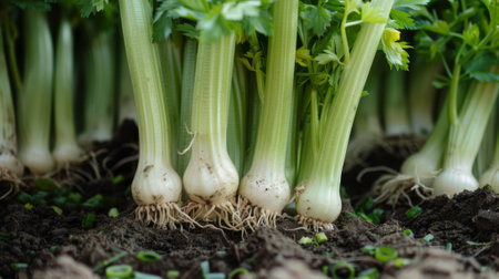 Green celery stalks stand upright, showcasing their sturdy roots. This natural arrangement highlights the freshness and quality of the vegetable.