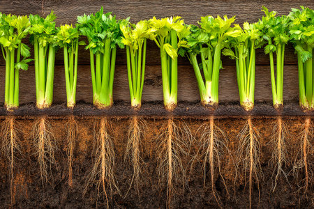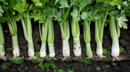 Fresh celery stalks stand upright with their roots exposed, showing the rich soil beneath, highlighting the natural beauty of plant growth and structure.