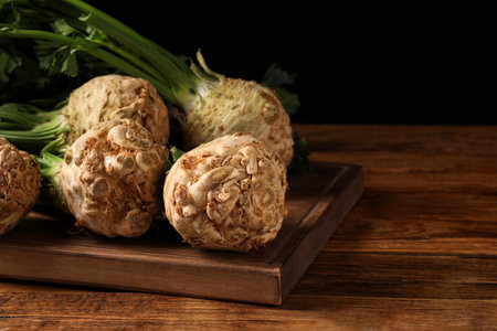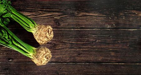 Celeriac root bulbs with green leaves on dark wooden board. Wide banner, space for text right side.