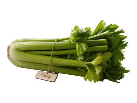 A bunch of fresh, green celery stalks, crisp and crunchy. This high-resolution, transparent PNG image shows vibrant, healthy celery on a white background, ideal for culinary websites, recipe blogs, health and wellness materials, and various design projects thanks to its transparency. Perfect for showcasing healthy eating and organic produce.