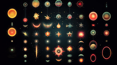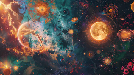 Cosmic alignment revealing stellar clusters, planetary arrangements, and celestial bodies glowing against dark expansive space backdrop, highlighting universal grandeur and astronomical beauty