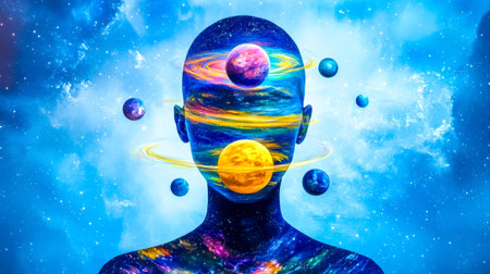 Human head silhouette filled with planets and stars representing universe and knowledge