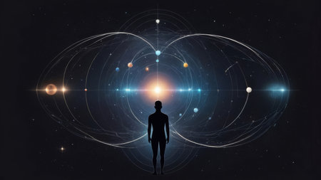 A mans body is encompassed by dynamic lines and twinkling stars, creating a surreal and ethereal scene of interconnectedness.