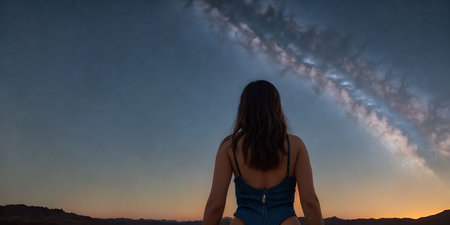 Nighttime silhouette with starry sky backdrop featuring the ethereal Milky Way. Concept Neon lights in the city, Urban exploration, Graffiti art, Street performers, Moody black and white portraits