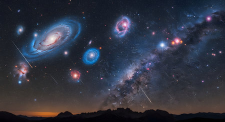 A spectacular composite photograph of a fantasy night sky, teeming with celestial wonders above a mountain silhouette. The vibrant Milky Way stretches across the scene, surrounded by numerous colorful spiral and elliptical galaxies, bright stars, and streaking meteors. This awe-inspiring image captures the immense beauty and diversity of the cosmos.