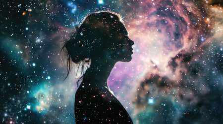 A captivating silhouette of a woman against a vibrant cosmic background filled with stars and colorful nebulae, evoking emotions of imagination and tranquility.