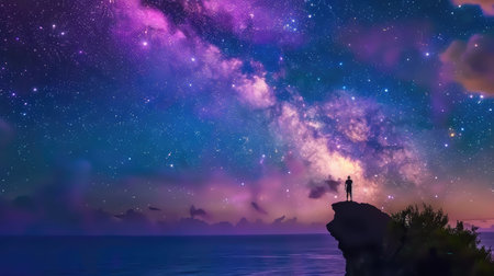 A breathtaking night scene depicts a vibrant star-filled sky with a person standing on a cliff by the sea, inspiring feelings of wonder and tranquility.
