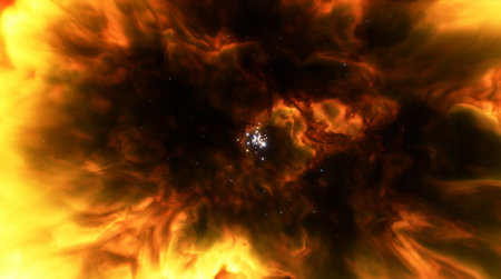 A stunning explosion of fiery colors bursts forth from dark clouds, creating a dramatic cosmic spectacle.