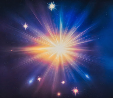 A vibrant star bursts in a colorful display of light and energy, surrounded by cosmic dust and distant stars.