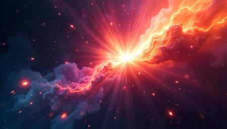 An awe-inspiring explosion of energy and light occurs in deep space, creating vivid colors and patterns.