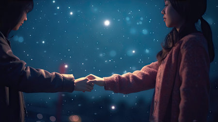 Couple in love holding each other hands under the starry sky. Love story