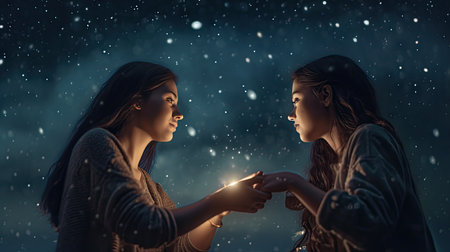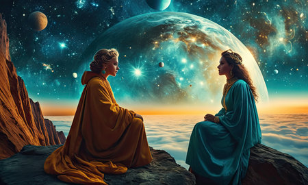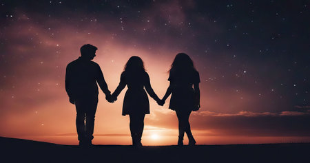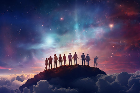 Silhouetted figures against a cosmic background, holding hands. Fantasy illustration in purple and blue colors. Concept of connection with universe. Ideal for themes of unity, exploration, digital art